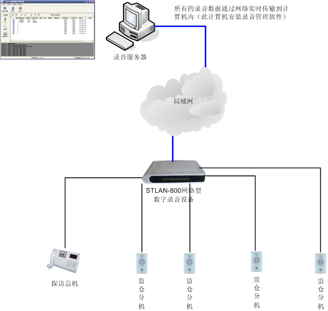 如果探訪對講和監(jiān)倉對講設(shè)備有摘機(jī)和掛機(jī)功能,我們通過標(biāo)準(zhǔn)的壓控方式對它們進(jìn)行錄音,錄音的方式與對電話線路錄音一眼。如果沒有摘機(jī)和掛機(jī)功能,我們可以以聲控的方式錄音,采用并線的方式獲取音頻信號送給STLAN錄音設(shè)備。錄音設(shè)備將模擬信號音轉(zhuǎn)成數(shù)字信號,實(shí)時(shí)通過網(wǎng)絡(luò)傳至錄音服務(wù)器,進(jìn)行永久保存,可以隨時(shí)查詢調(diào)用。通過服務(wù)器端軟件,可以實(shí)現(xiàn)實(shí)時(shí)監(jiān)聽。局域網(wǎng)中的任意計(jì)算機(jī)都可以通過web瀏覽器查詢數(shù)據(jù),客戶端不需要安裝任何軟件。