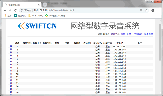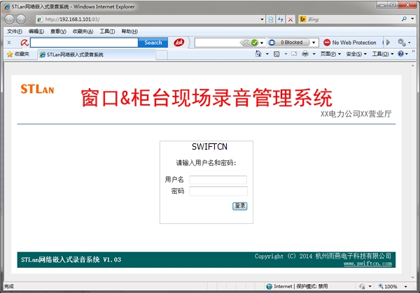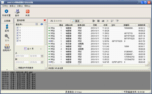 g. 系統(tǒng)設(shè)置、錄音查詢便利?;赪EB界面,支持遠(yuǎn)程設(shè)置,系統(tǒng)可設(shè)置多臺(tái)放音終端,具有聲卡的計(jì)算機(jī)或筆記本電腦都可以作為放音終端,無需特殊硬件,客戶端無需安裝任何特殊軟件。只要在IE地址欄輸入錄音服務(wù)器IP地址,放音終端即可對(duì)所有電話按錄音時(shí)間、電話號(hào)碼等信息進(jìn)行查聽。