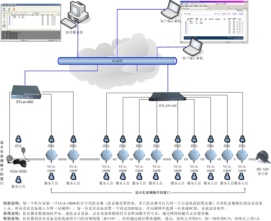 在每一個(gè)窗口或者柜臺(tái)放置一個(gè)拾音器,從機(jī)房布2芯RVVP音頻專用線纜,連接拾音器的對(duì)應(yīng)線纜,機(jī)房這頭連接STLAN網(wǎng)絡(luò)型數(shù)字錄音設(shè)備的音 頻輸入接口,從機(jī)房布2芯電源線纜或者就近取電。通常采用集中供電方式,一個(gè)合適的電源可以同時(shí)給數(shù)個(gè)VCA-100W拾音器供電。安裝軟件,并且進(jìn)行配 置。