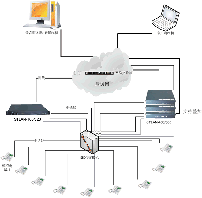 錄音存儲(chǔ)服務(wù)器與STLAN硬件通過(guò)標(biāo)準(zhǔn)TCP/IP協(xié)議網(wǎng)絡(luò)相連,因此不受限于服務(wù)器存放位置,錄音設(shè)備可以放在任何有網(wǎng)絡(luò)接口的地方。